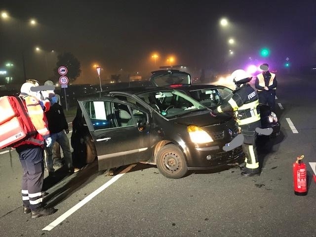 Einsatzbericht Bei einem Verkehrsunfall mit zwei Fahrzeugen wurden zwei Personen verletzt. Die Feuerwehr wurde alarmiert, da von eingeschlossenen Personen ausgegangen wurde. Diese wurden aus ihren Fahrzeugen gerettet. Die Einsatzstelle wurde abgesichert und ausgeleuchtet.